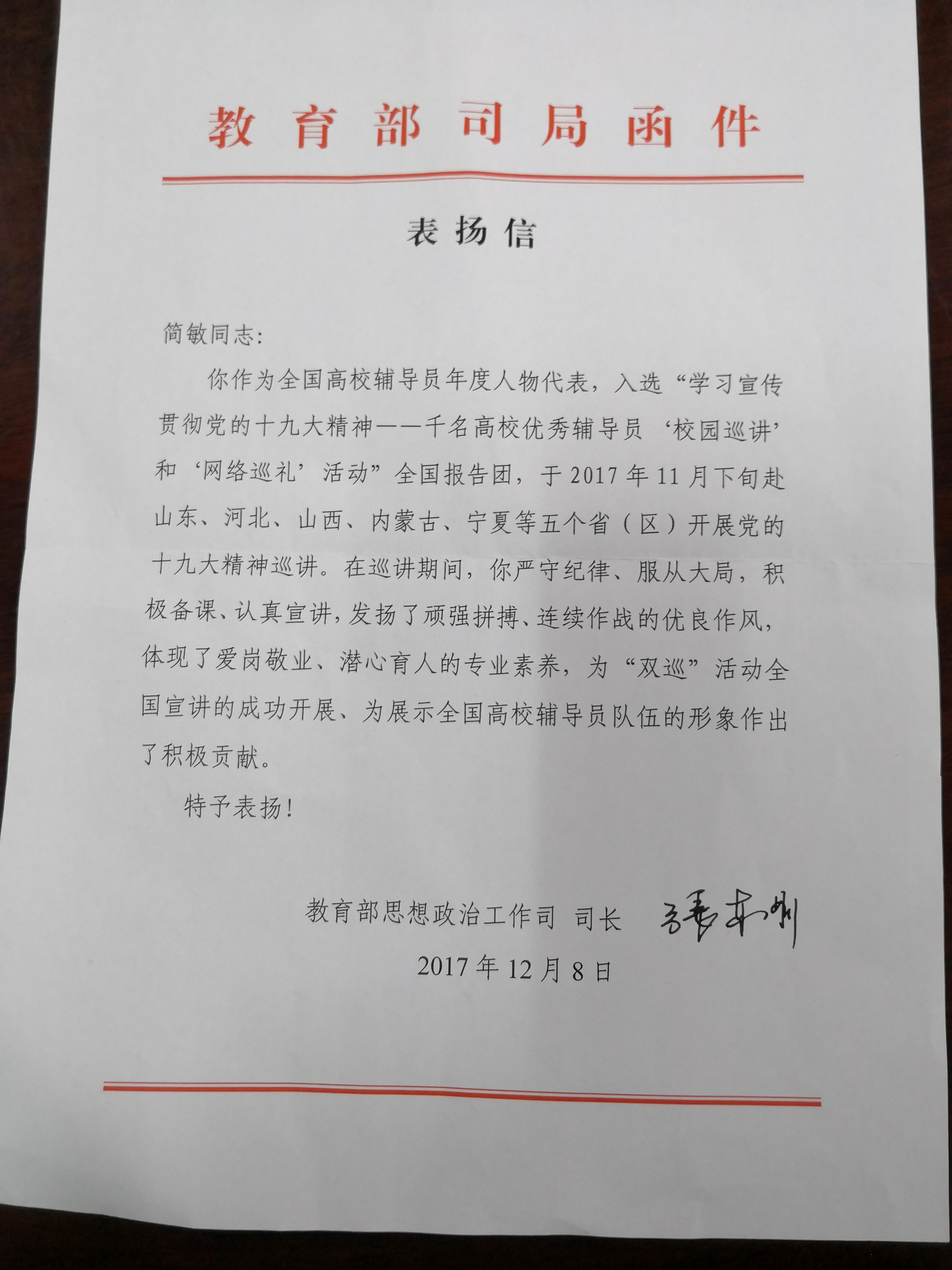 近日,教育部思想政治工作司给入选教育部组织开展的全国高校千名优秀辅导员学习宣传贯彻党的十九大精神“校园巡讲”和“网络巡礼”活动(简称“双巡”)全国报告团的我校辅导员简敏教授发来表扬信,对其在巡讲期间的表现给予高度肯定和积极评价。表扬信全文如下:
